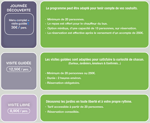 Pour une réservation du forfait-journée avec déjeuner un acompte de 250€ est demandé suite à un accord sur la disponibilité d'une date de visite des jardins.